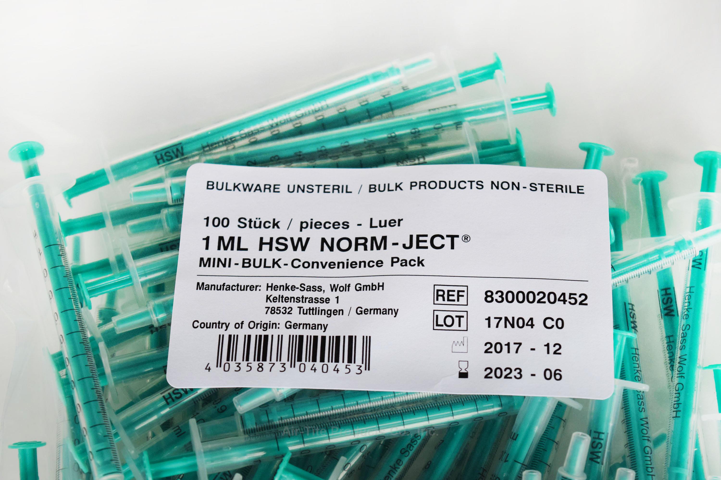 2-Part syringes are latex free, and contain no rubber, silicone oil, styrene or DEHP. These syringes are the choice for any situation needing an inert, non-reactive syringe. Manufactured only from laboratory grade polypropylene and polyethylene. These unique plastic syringes are more chemically resistant than rubber-tipped syringes and have a positive safety stop to help prevent accidental spills.