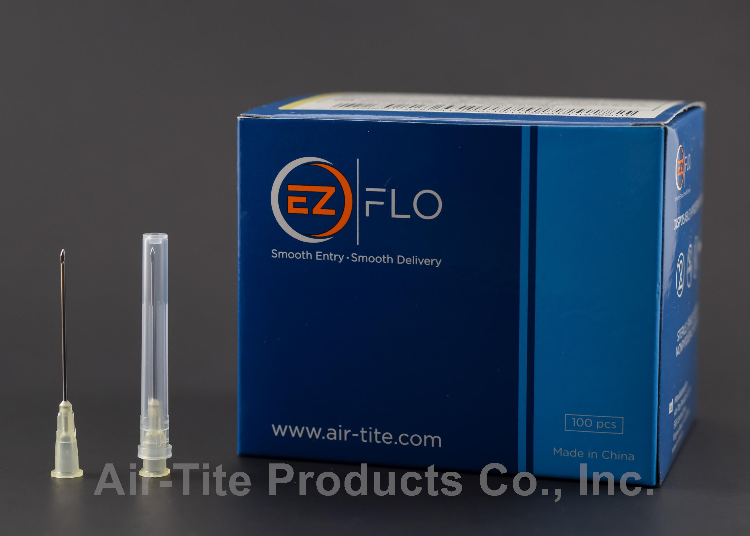Air-Tite Product's newest addition, the EZ FLO line of hypodermic needles, offer high quality and a broad selection at an affordable price. Ranging from 18 gauge to 30 gauge, these needles offer a standard bevel, thin wall from 18g to 25g and regular-wall in 27g and 30g to combine comfort and durability. Each needle is sterile, individually packaged in a box of 100. Made of surgical stainless steel and a polypropylene hub.
